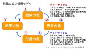 次に重要なのは「関係の質」の向上による成果です。「関係の質」という概念はMIT(マサチューセッツ工科大学)の元教授であるダニエル・キム氏が提唱した組織の成功循環モデルに基づいています。このモデルは、組織の成果を上げるために関係性の質を高めることが重要であるということを強調しています。組織の成功を促進するために以下の4つの質が重要です。